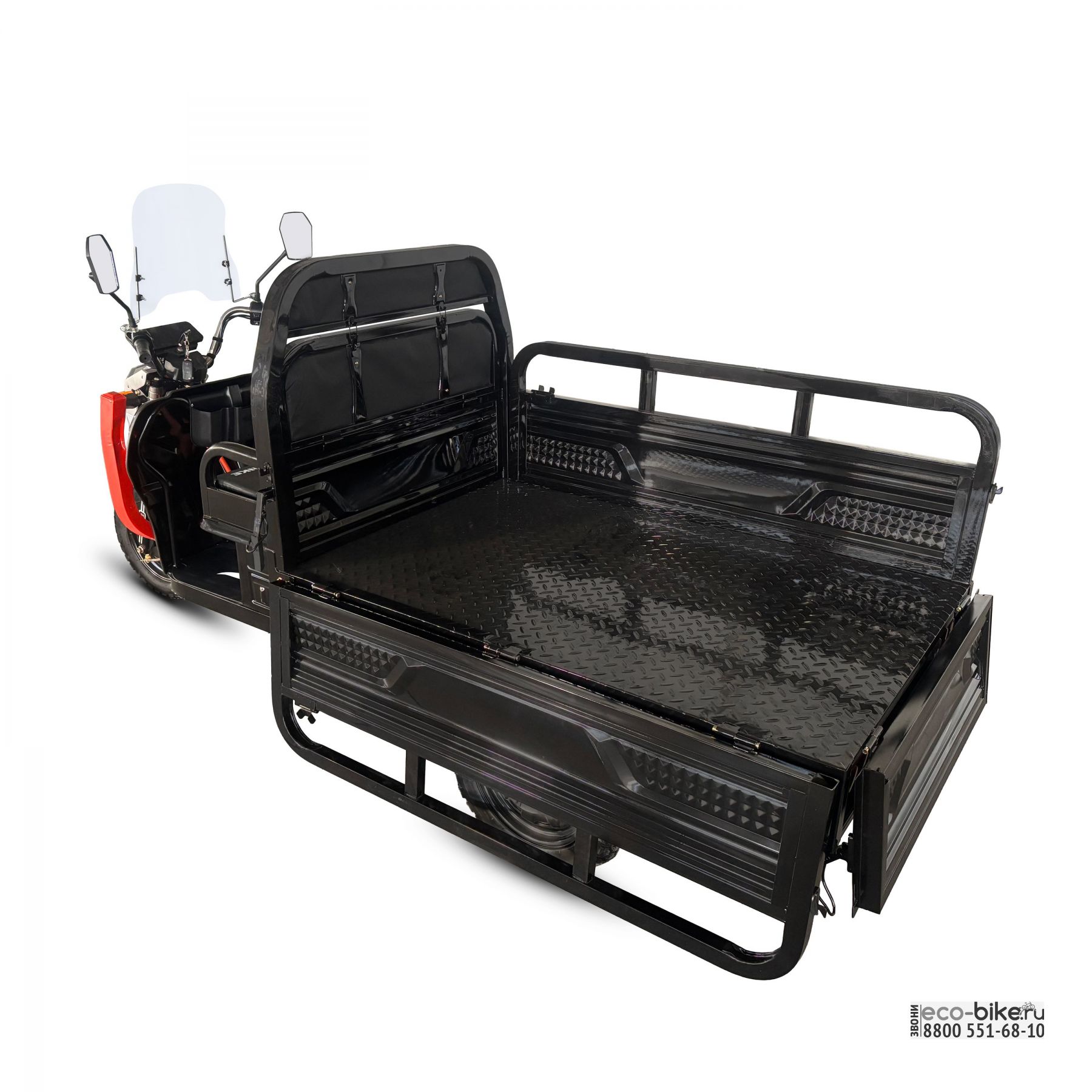 Оптимальный кузов размером 1500 × 1000 × 450 мм, усиленный вертикальными 2 рейками, откидные борта на быстросъёмных петлях с ограничителями, цельные усиленные борта из ребристого металла, двойной железный бампер, передние световые элементы, хромированный руль с перекладиной, тормозная система с ручником, усиленный грузовой мост, 5-листовая рессорная подвеска, надёжная батарея 60V 48 А·ч и пониженная передача — всё это делает модель готовой к перевозке тяжёлых грузов в ежедневной эксплуатации.